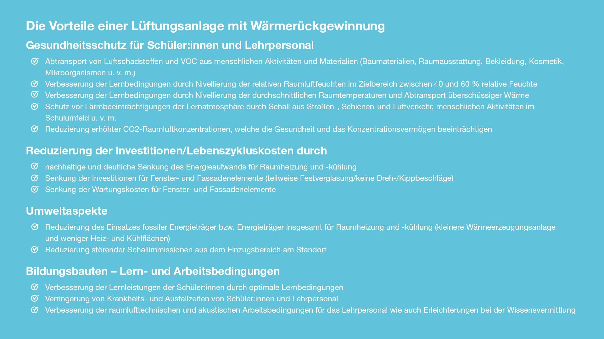 ln einen Klassenraum werden Luftschadstoffe aus vielen Quellen eingetragen, darunter flüchtige organische Verbindungen (VOC) aus Baumaterialien, Möblierung, Raumausstattung, technischer Ausstattung, Bekleidung und Kosmetik, aus Mikroorganismen oder auch menschlichen Aktivitäten. Ihr Abtransport schützt die Gesundheit von Lernenden und Lehrkräften nachhaltig. Zudem führen bessere Lernbedingungen nachweislich zu Verbesserungen der Lernleistungen von bis zu 8 % (Durchschnitt Zensuren).